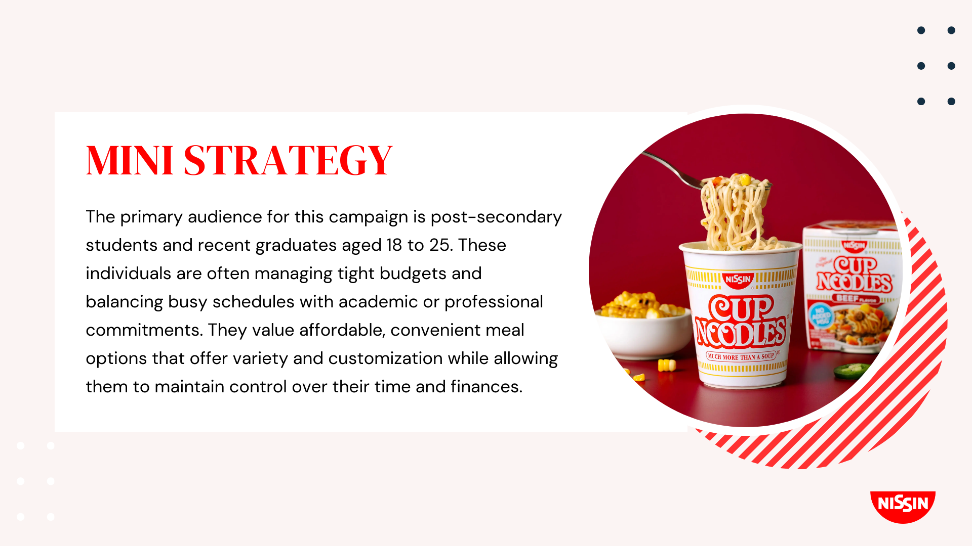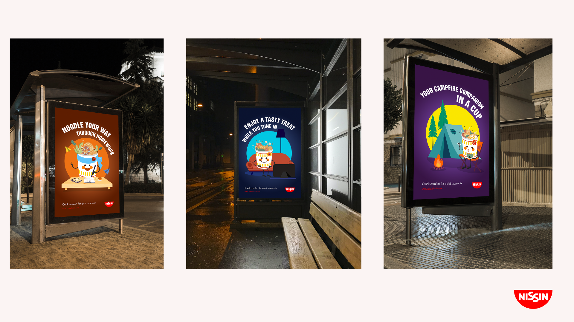 The Nissin Cup Noodles campaign centers around the idea that Cup Noodles provides "Quick comfort for quiet moments"—a perfect solution for busy students and recent graduates who seek convenient, budget-friendly meals that offer both comfort and versatility. Whether they're studying for exams, relaxing with friends, watching their favourite shows, or embarking on outdoor adventures, Nissin Cup Noodles adapts to their needs. It’s a simple, quick meal that not only satisfies hunger but also enhances their quiet moments of relaxation, making it an ideal companion for everyday life.